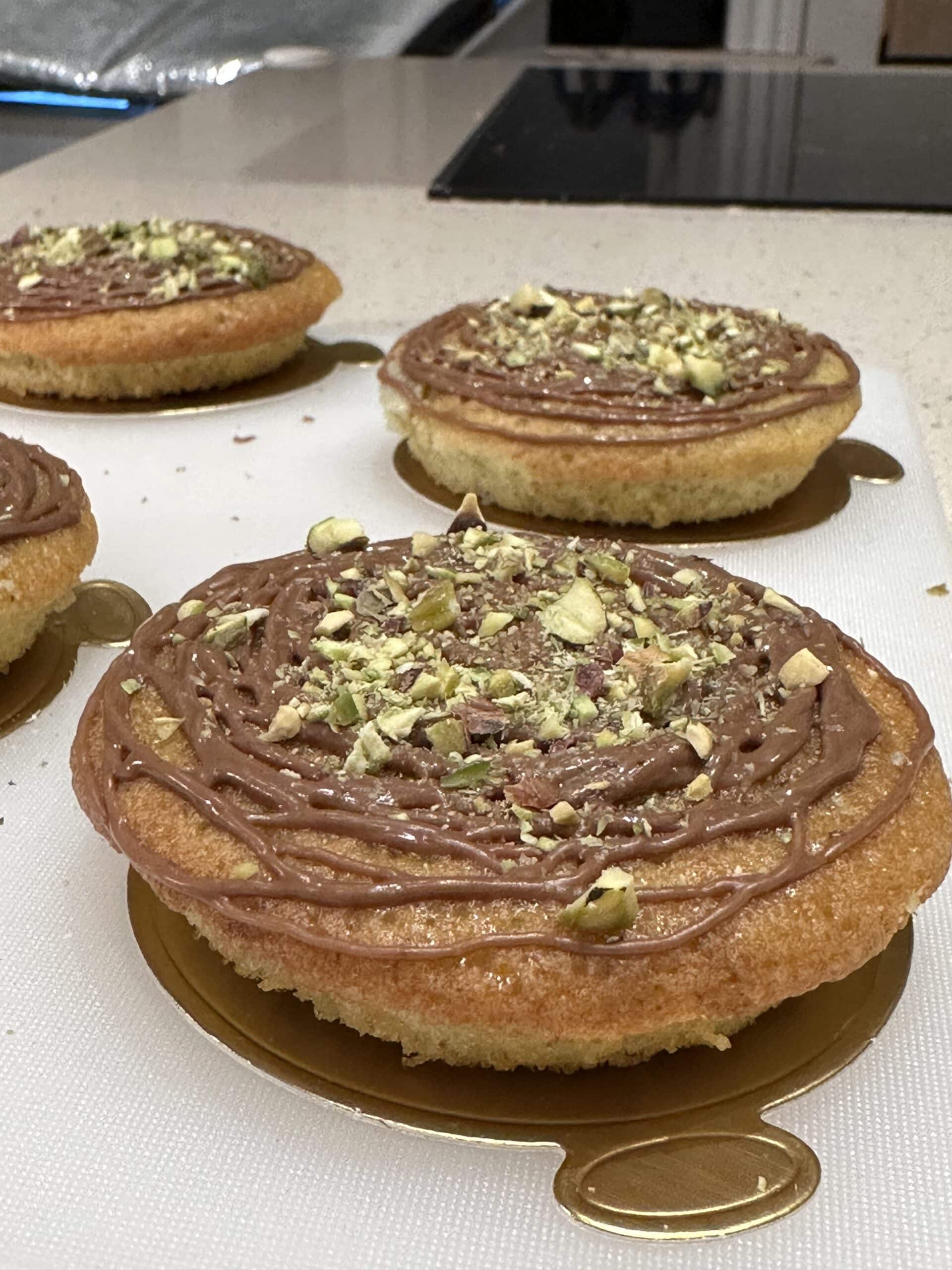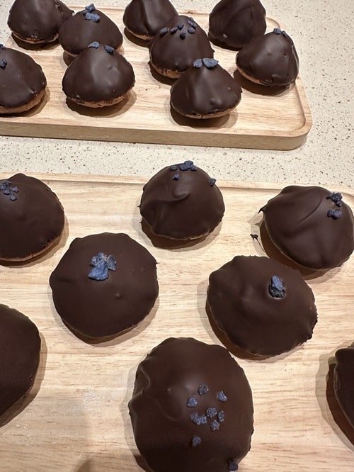 Små Sarah Bernhard-toppe – makronbund og chokoladeflødecreme, kogt med friske vaniljestænger, og betrukket med mørk chokolade. Æblekage