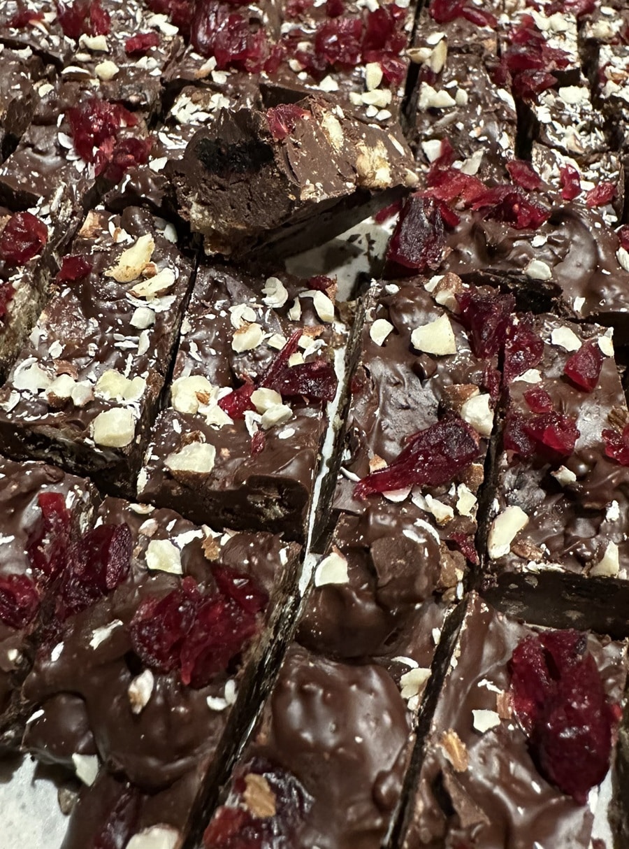 Chokoladebrud med mandelkrokant & økologiske, tørrede frugter på en smagfuld bund af 70 % chokolade. Julegrise