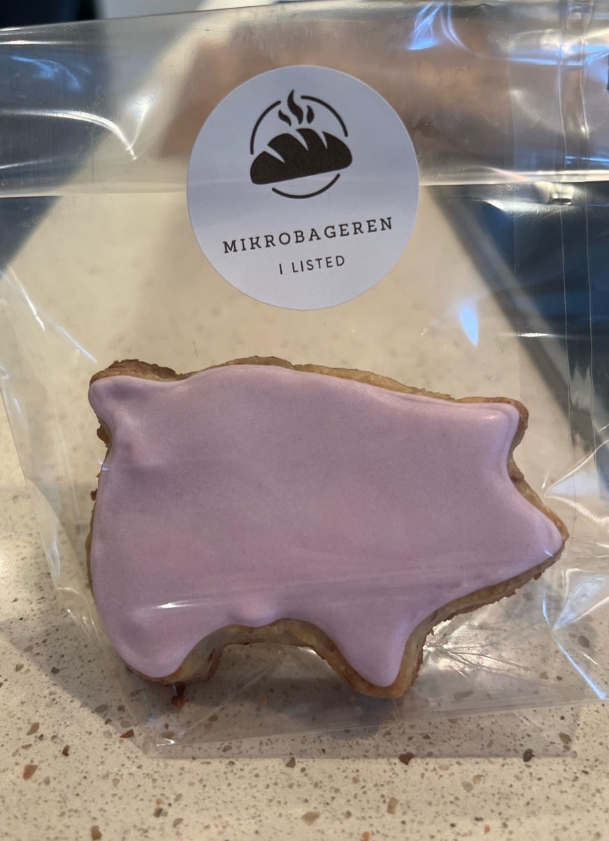 Julegrise. Bagt på vaniljekransedej og glaseret med hindbærglasur