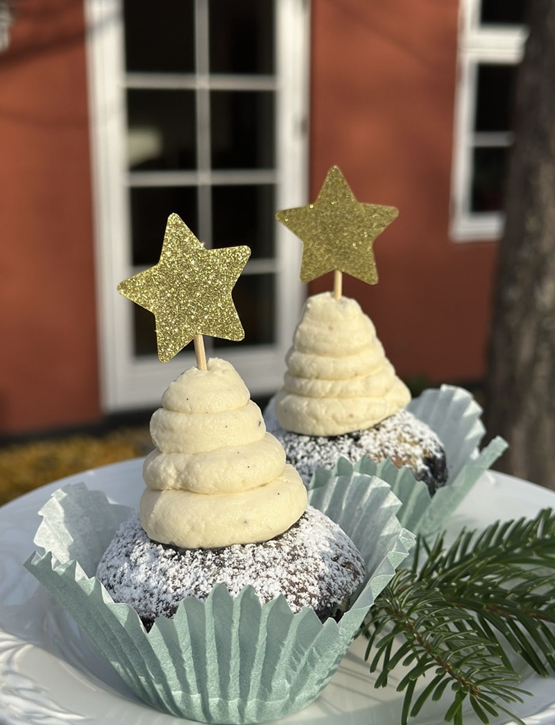 Blåbærmuffin med juletræ af hvid ganash kogt på økologisk fløde, hvid chokolade & ægte vanilje. Pistaciemazarin
